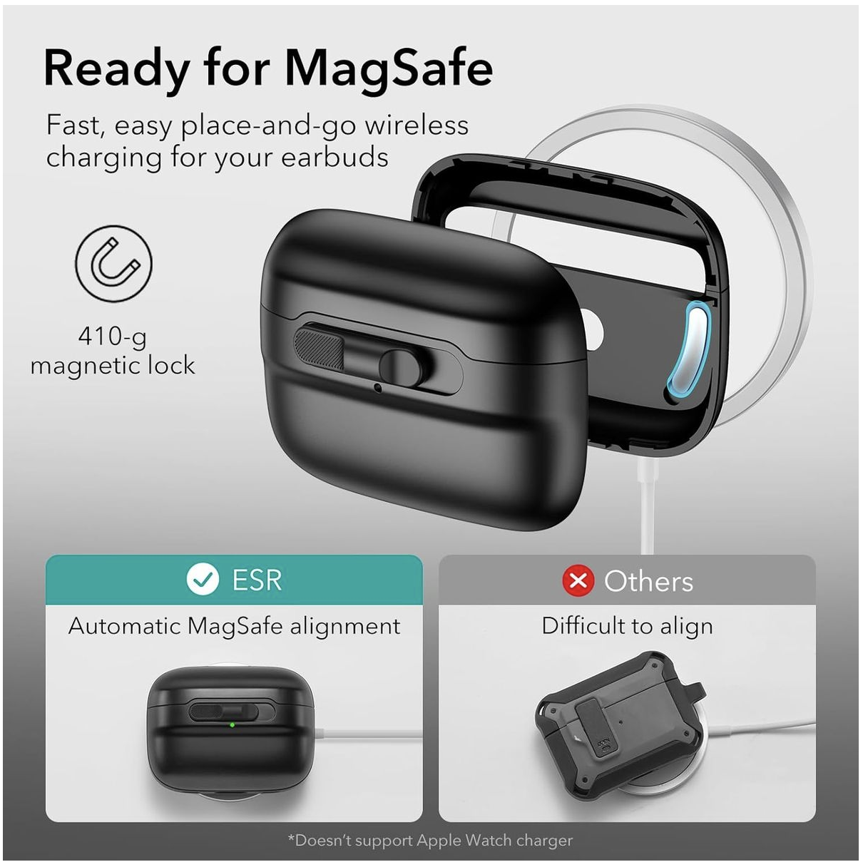 MagSafe Ready: strong magnets in the back of the case ensure a secure lock on MagSafe chargers, letting you enjoy tap-and-go wireless charging for your earbuds