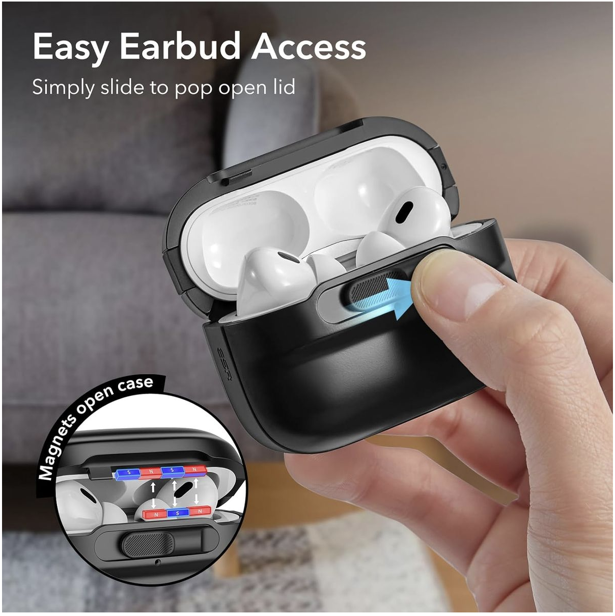Slide to Open: swiping the rubber slider on the front opens the latch and reverses the polarity of the magnets so the lid springs open and gives you instant access to your earbuds with just one hand