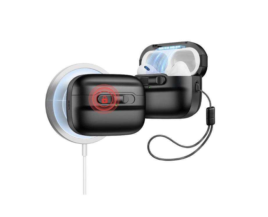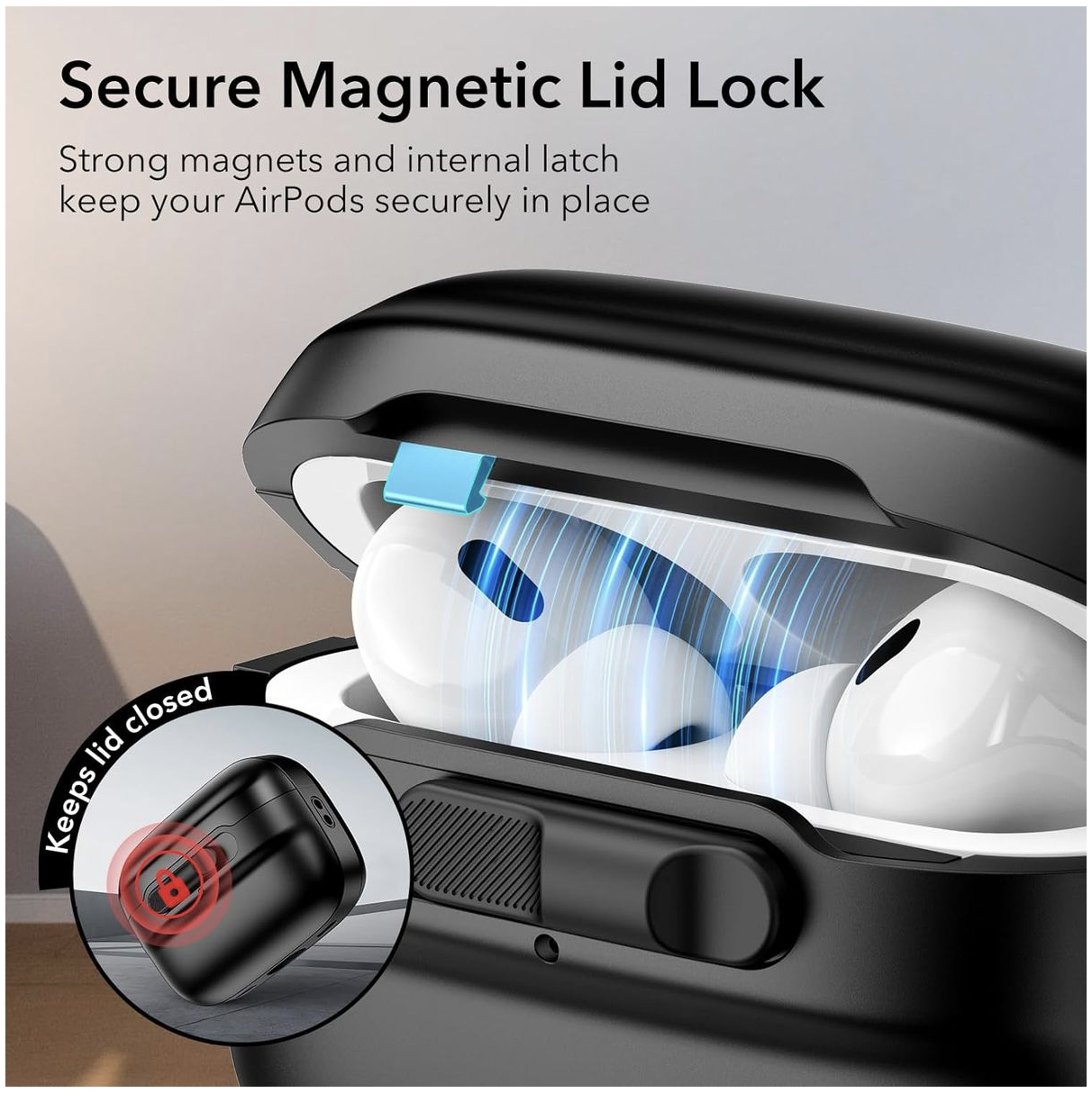 Drop-Proof Lid Lock: strong magnets with 700 g of holding force in the top and bottom of the lid and an internal latch keep your AirPods locked safely inside so they won’t pop out if dropped